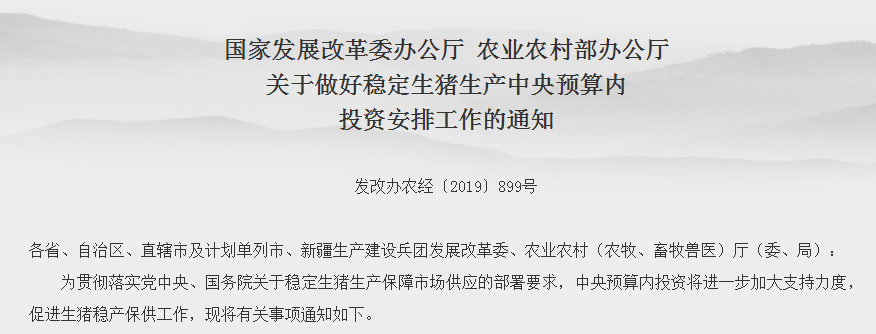 据发改委网站消息,国家发展改革委办公厅、农业农村部办公厅近日联合发布《关于做好稳定生猪生产中央预算内投资安排工作的通知》(以下简称《通知》)。